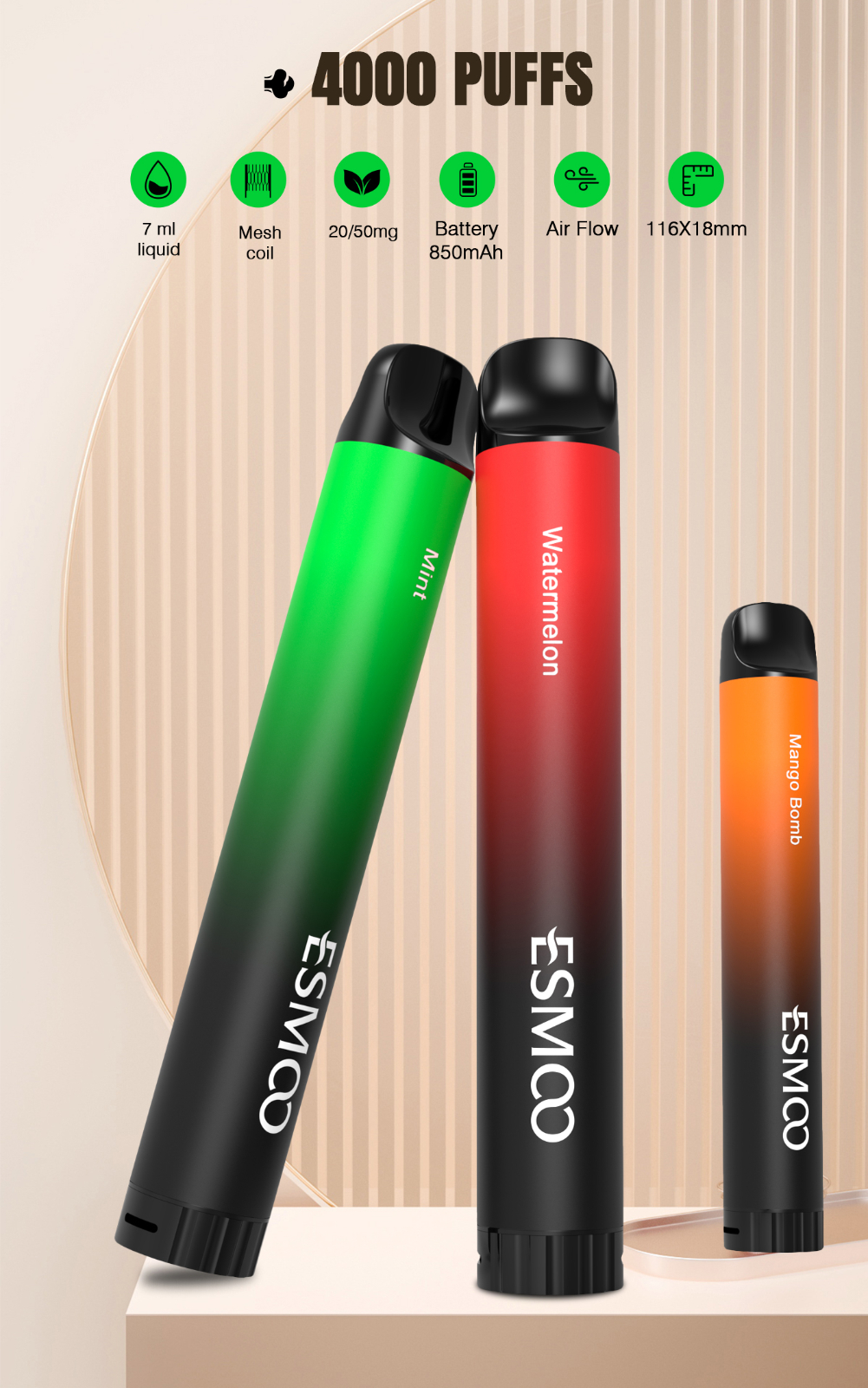 ESMOO B2 4000 Puffs Disposable Vape Pen Tube E-cigarette Airflow Adjustable