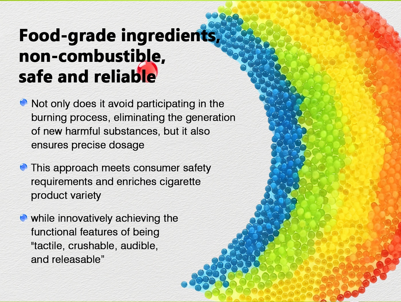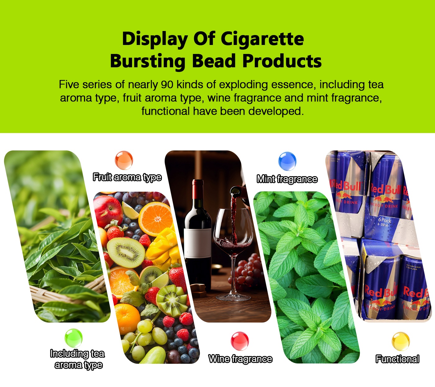 As a novel flavoring method for cigarettes, adding flavor beads to the filter of cigarettes can enhance taste, reduce tar and harm, maintain moisture, and boost aroma. Not only does it avoid participating in the burning process, eliminating the generation of new harmful substances, but it also ensures precise dosage. This approach meets consumer safety requirements and enriches cigarette product variety while innovatively achieving the functional features of being "tactile, crushable, audible, and releasable.