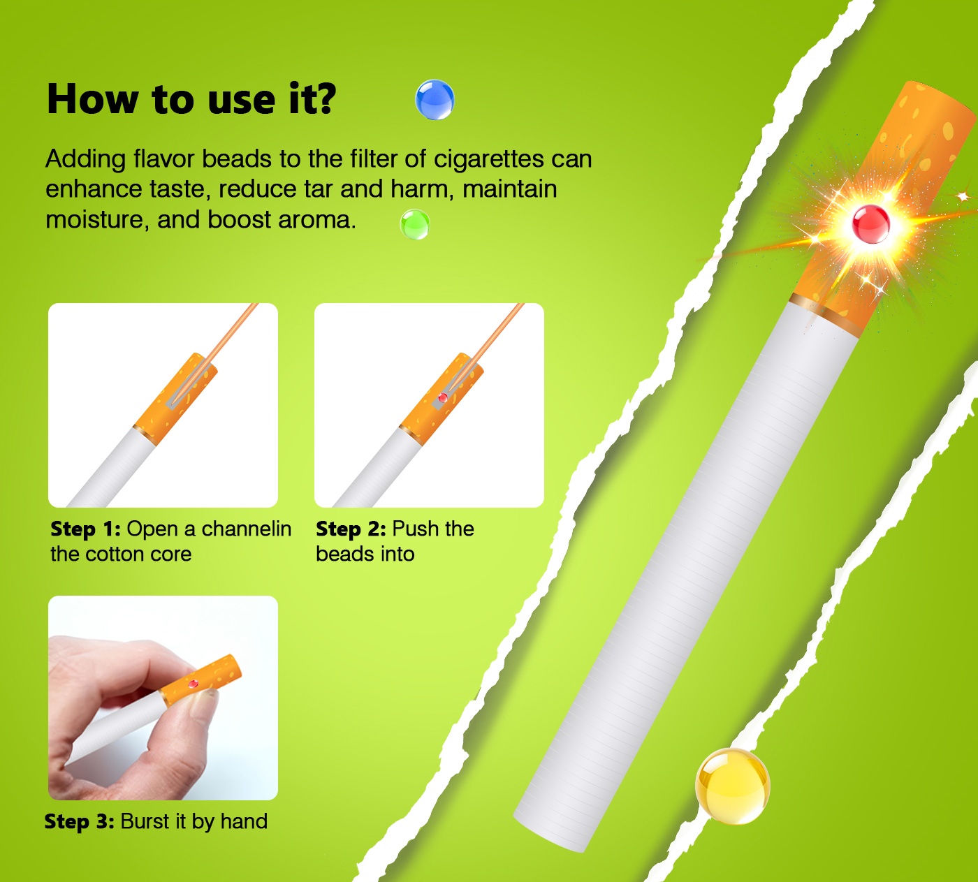 4 Adding flavor beads to the filter of cigarettes can enhance taste, reduce tar and harm, maintain moisture, and boost aroma.