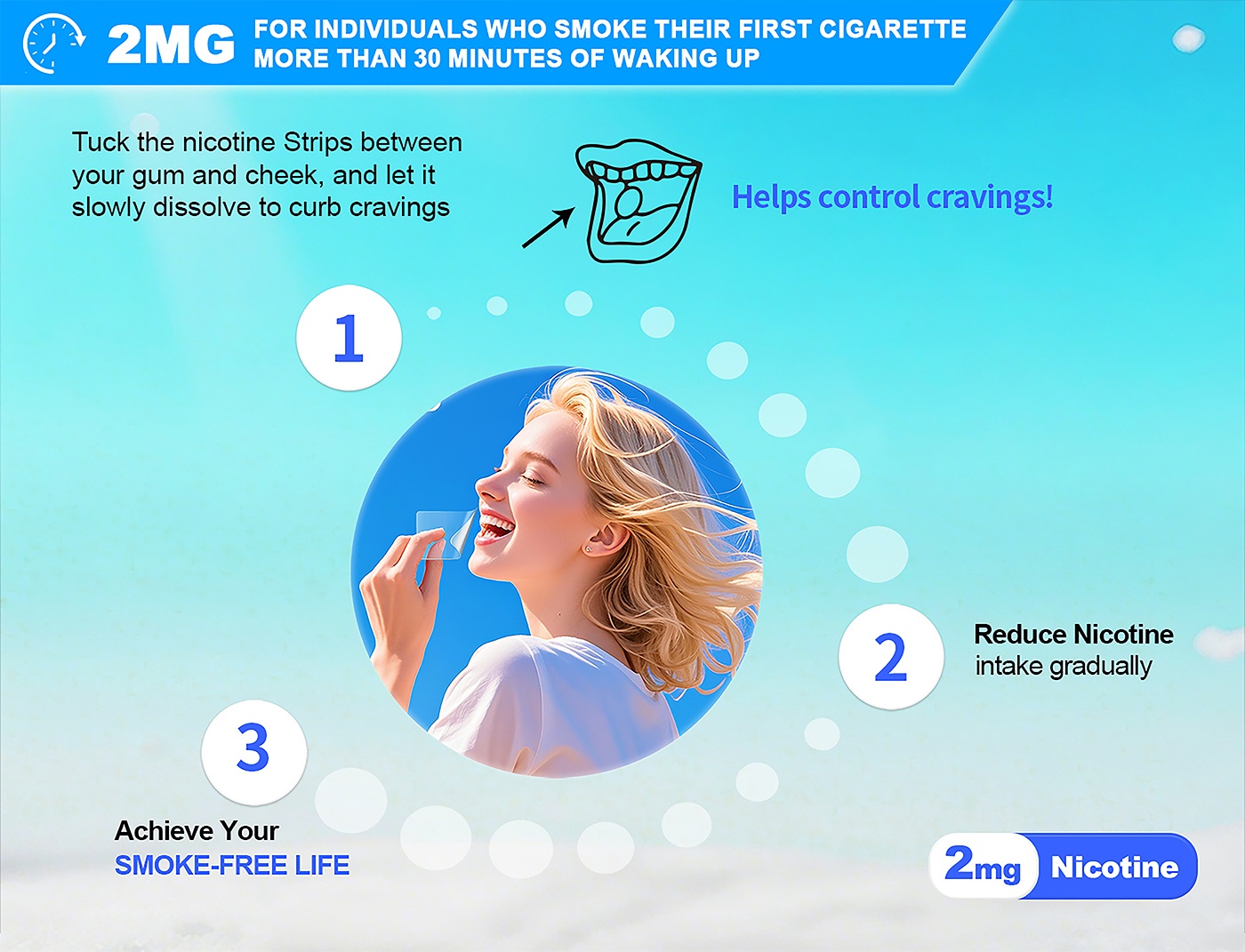 If you smoke your first cigarette more than 30 minutes after waking up,please use Nicotine strip 2 mg, but if within 30 minutes of waking up,it is 4mg.