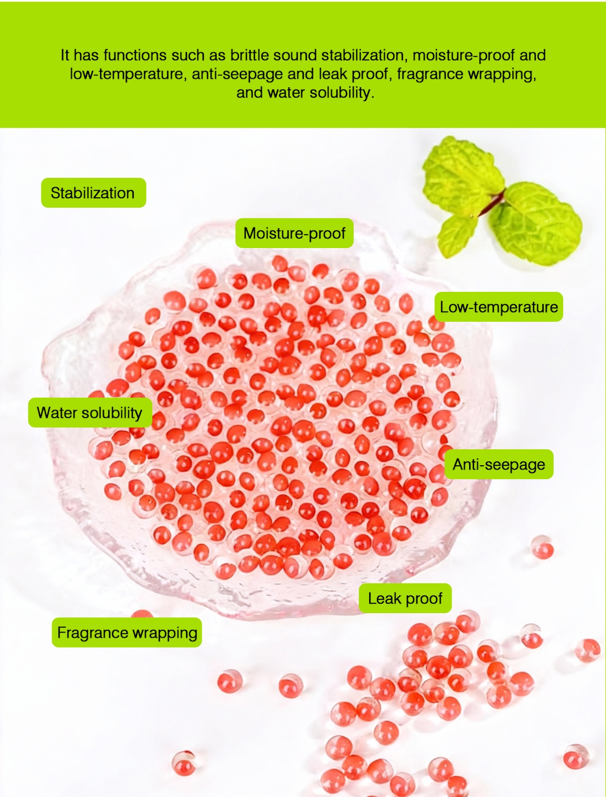 2 It has functions such as brittle sound stabilization, moisture-proof and low-temperature, anti-seepage and leak proof, fragrance wrapping, and water solubility.